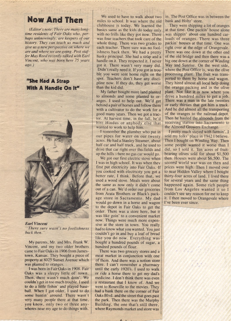 Earl Roscoe Vincent![]() Earl married Leona Clydesdale and is remembered fondly by all who knew him. He was a farmer in Sacramento County for most of his adult life. Pictured on the right is an article written about him. He was known as "Grandpa V" to his grandchildren, great grandchildren and those neighborhood children who adopted him. He and Leona were married more than 50 years. Mom says that I would have really liked him. |