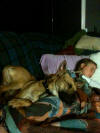 | June 4, 2011 Trail Maintenance - Hidden Falls, Auburn CA. What a miserable rainy day to be out doing trail work. Thank goodness Mom's and kids got the tree trimming detail while Dad went off to cut more trail. Mom and I got to trim up tree growth and clear the weeds around the base to keep the fire danger low to the trees. This way if a fire did come through, there wouldn't be small stuff to burn. After we were done, we waited in the car for Dad for a while with our picnic lunch and dry clothes. I was one pooped puppy when I got home and Mom snapped a shot of me and my dog crashed out on the couch.